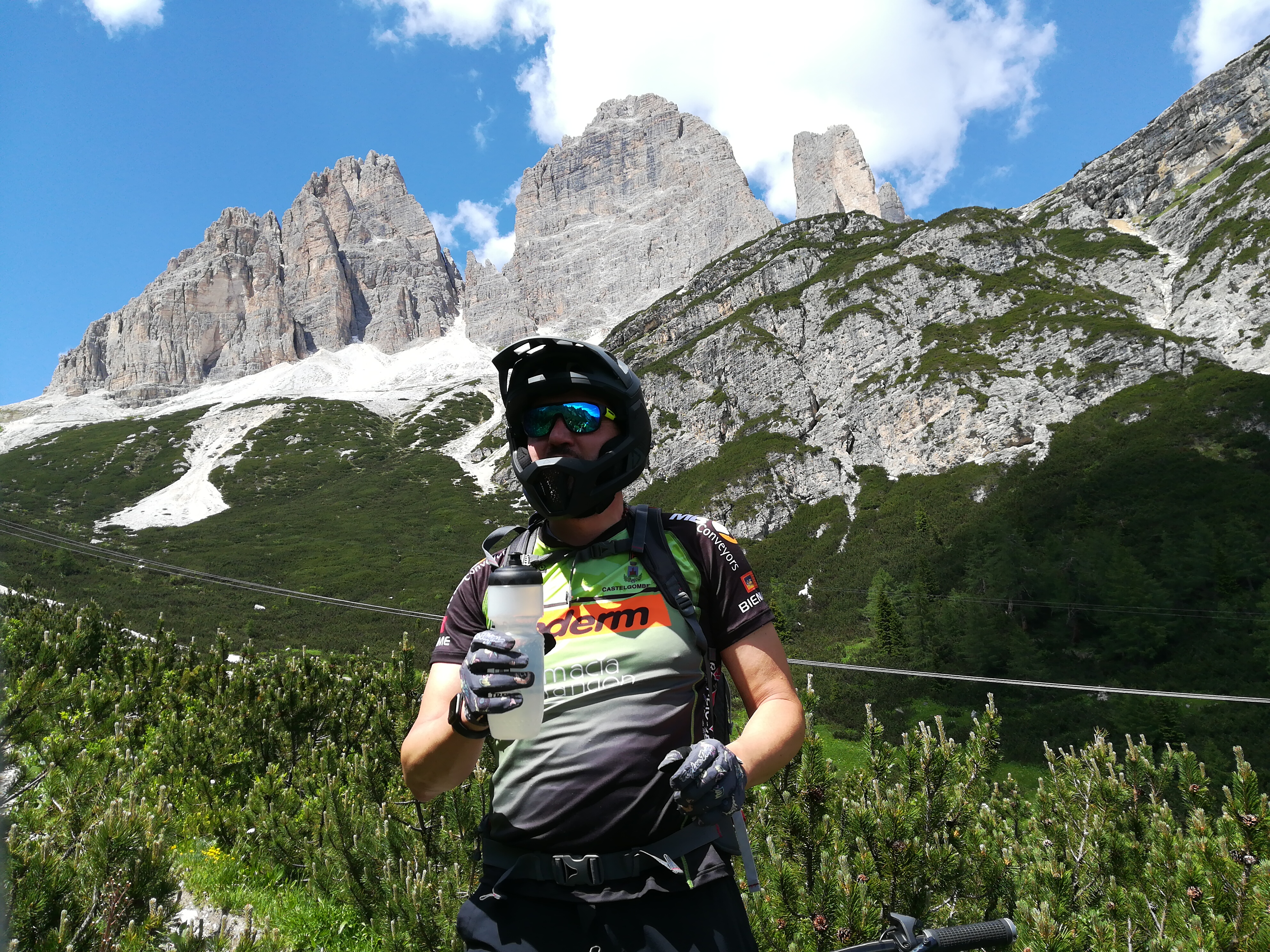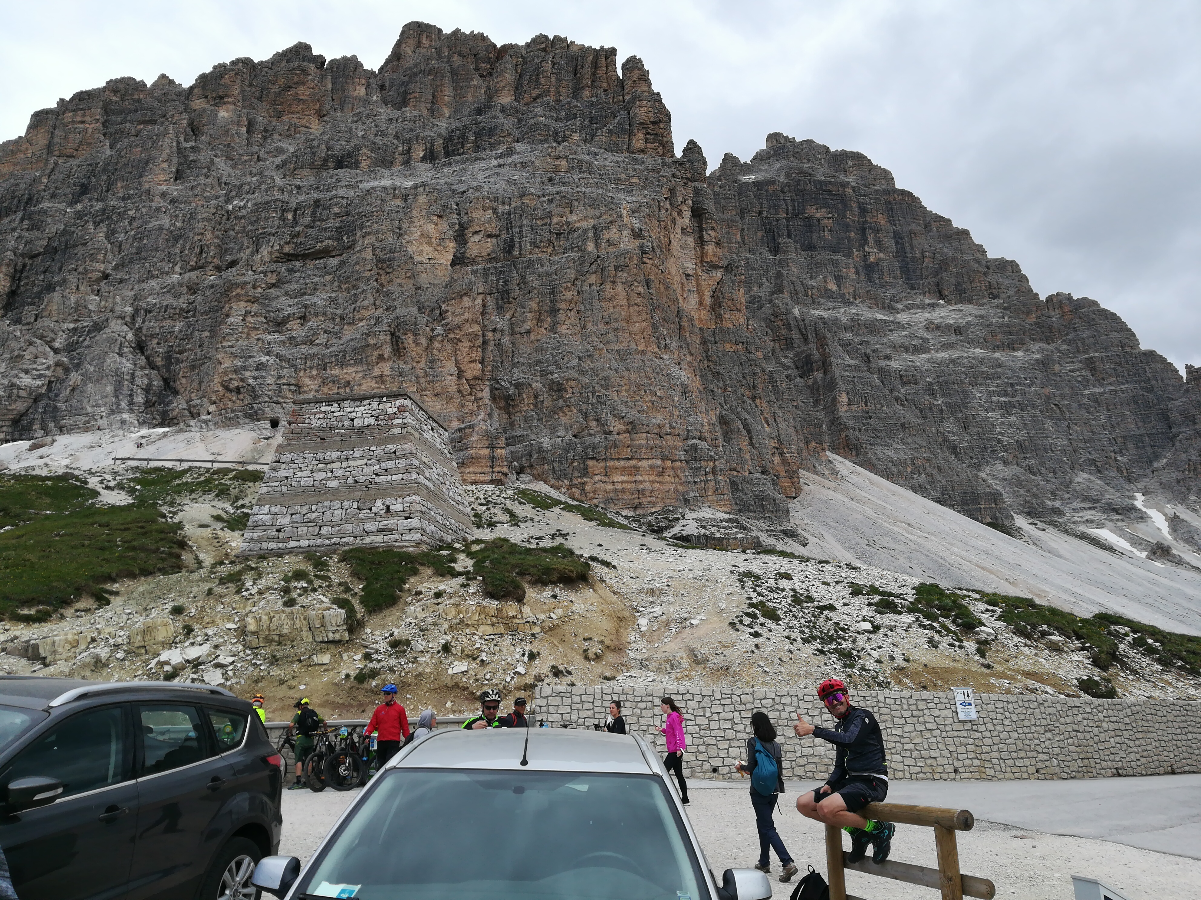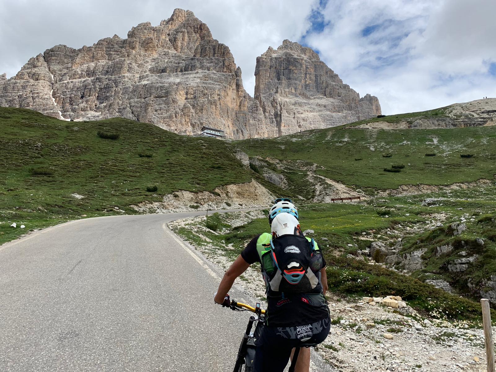A Cortina ci accoglie il sole e pedalando lungo i sentieri fra monti, boschi e corsi d’acqua arriviamo alla salita che porta alle 3 cime di Lavaredo, dove ristoriamo pancia e batterie al rifugio Auronzo.