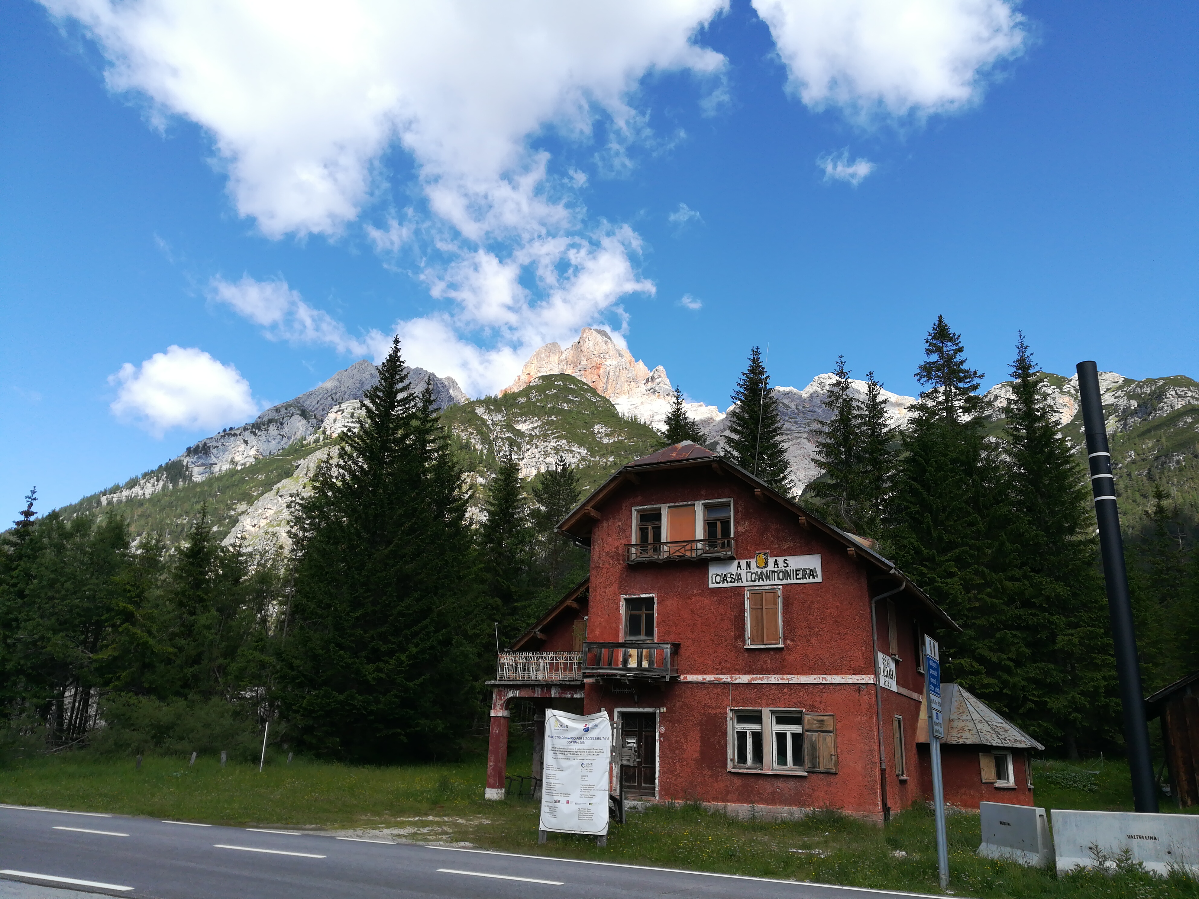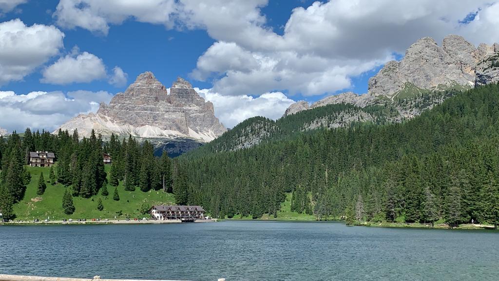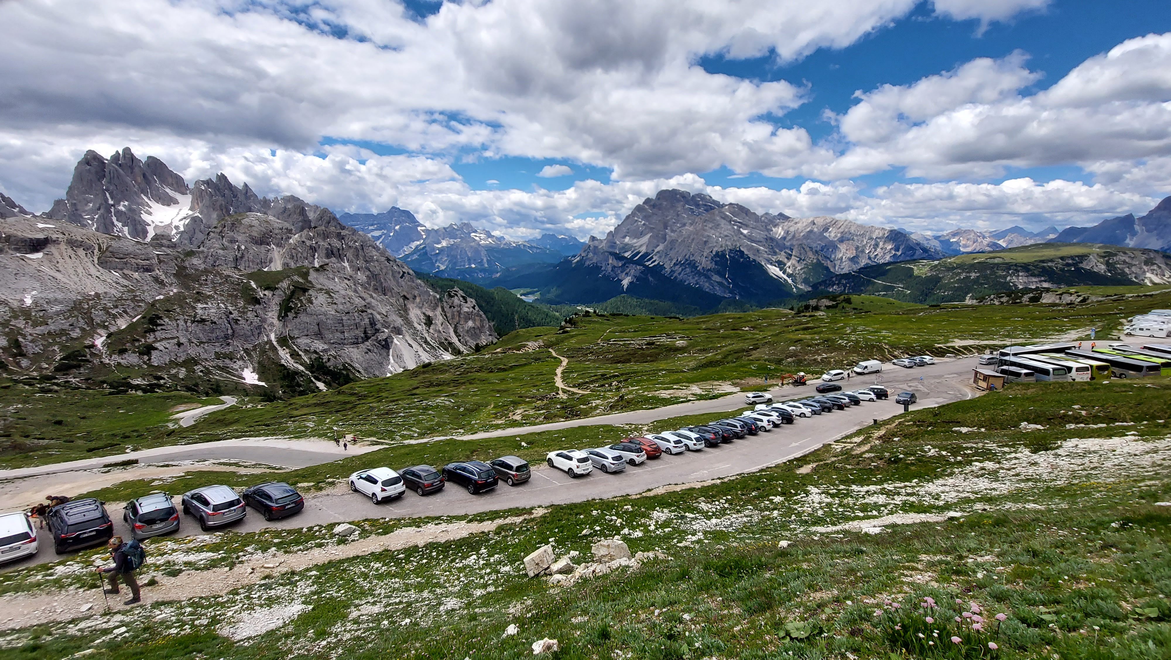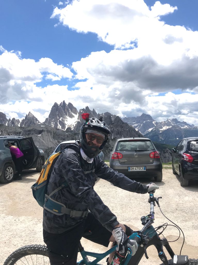A Cortina ci accoglie il sole e pedalando lungo i sentieri fra monti, boschi e corsi d’acqua arriviamo alla salita che porta alle 3 cime di Lavaredo, dove ristoriamo pancia e batterie al rifugio Auronzo.