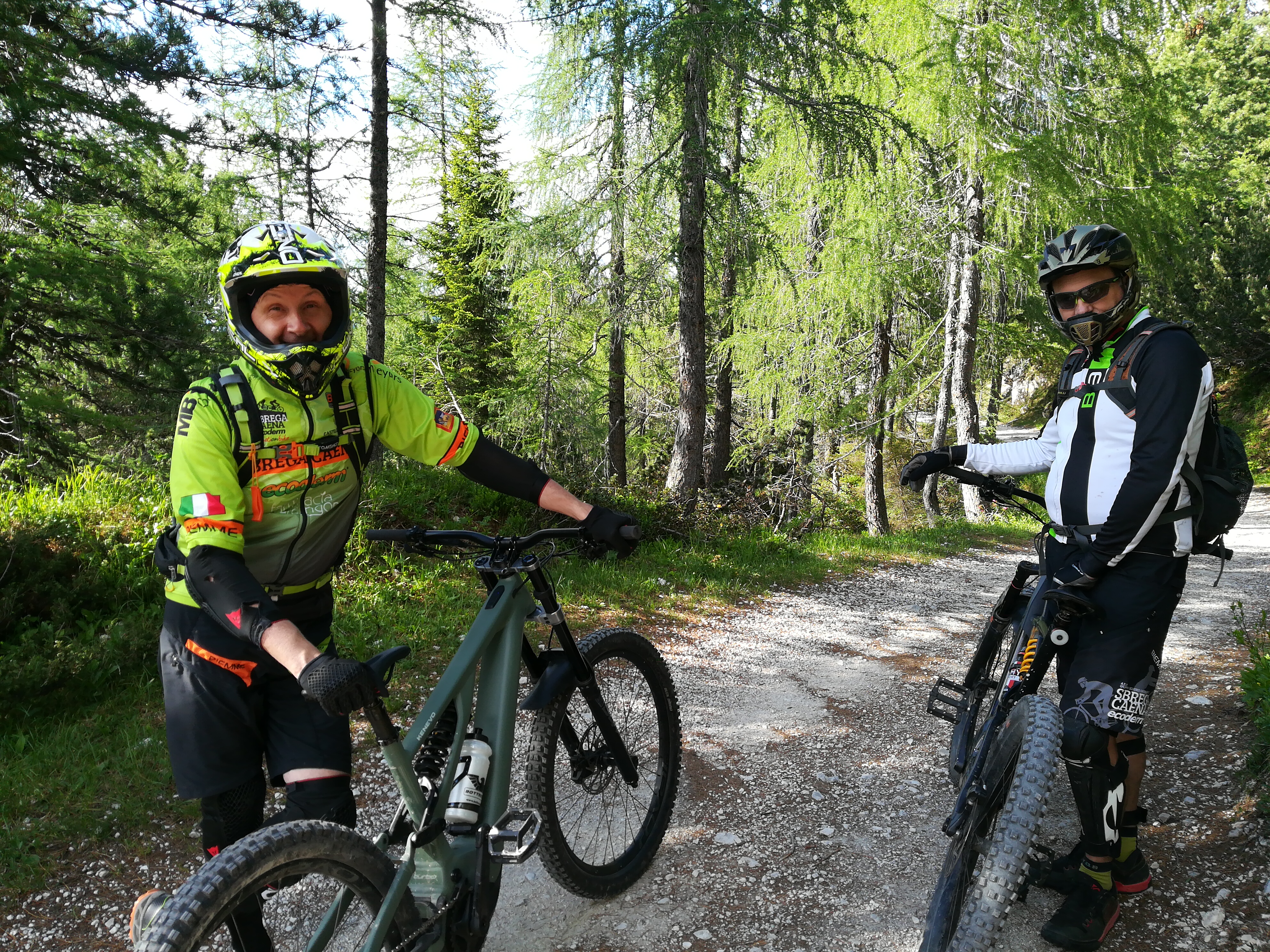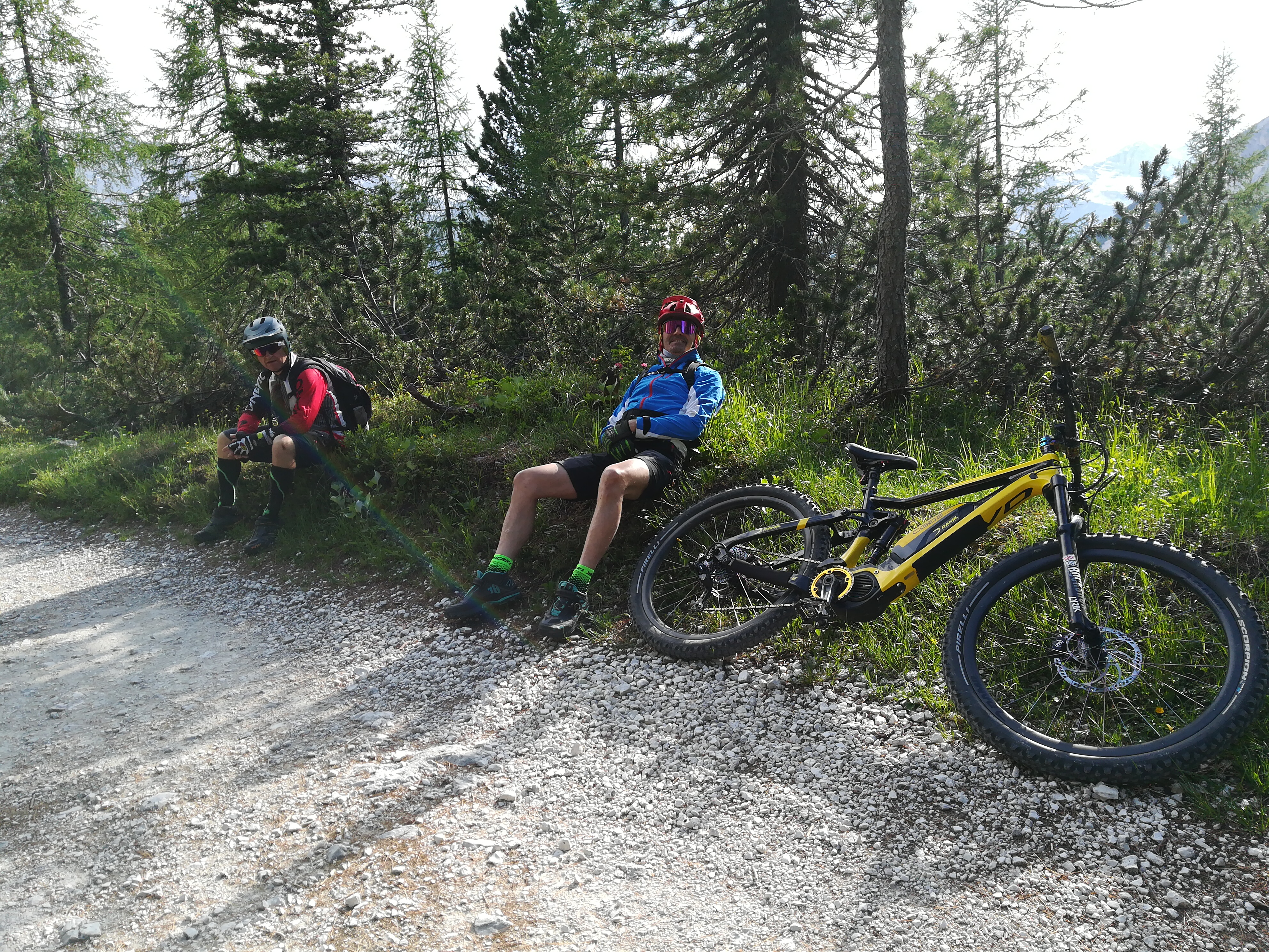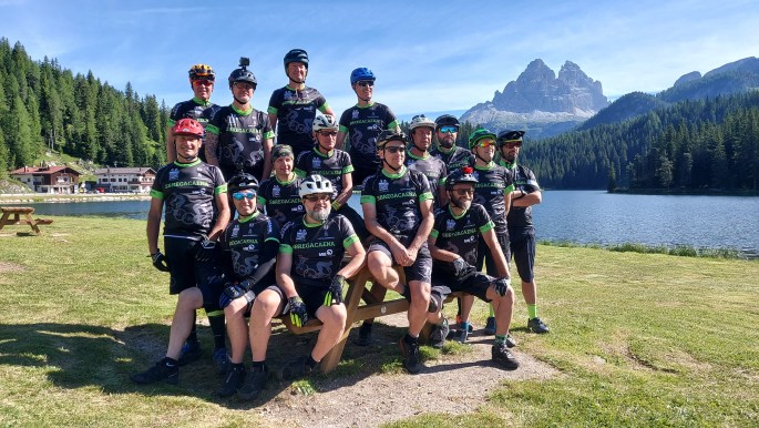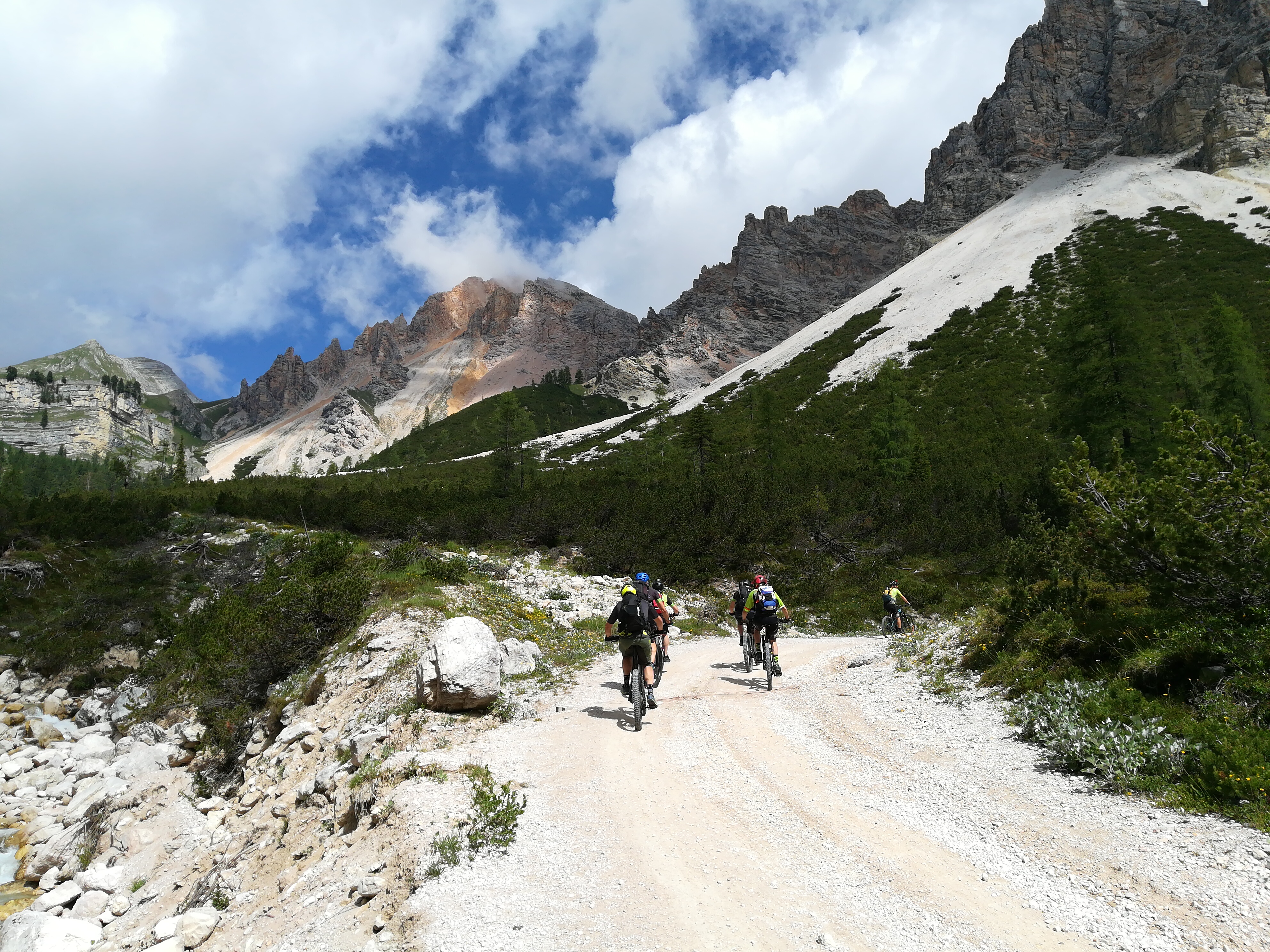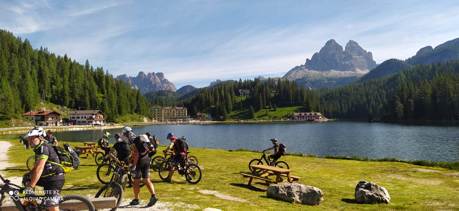Per rendere il tutto più emozionante la “sfiga” ci mette lo zampino e inizialmente un biker ritorna anzitempo al riposo finale causa lievi problemi fisici poi risolti, affrontiamo la rottura di un cambio, sistemata brillantemente dai nostri meccanici e infine l’esaurimento di una batteria in salita, superata spingendo e trainando a turno lo sfortunato. Ciononostante scendiamo lungo il sentiero 120 e alla fine il lago di Misurina ci accoglie tutti felici.