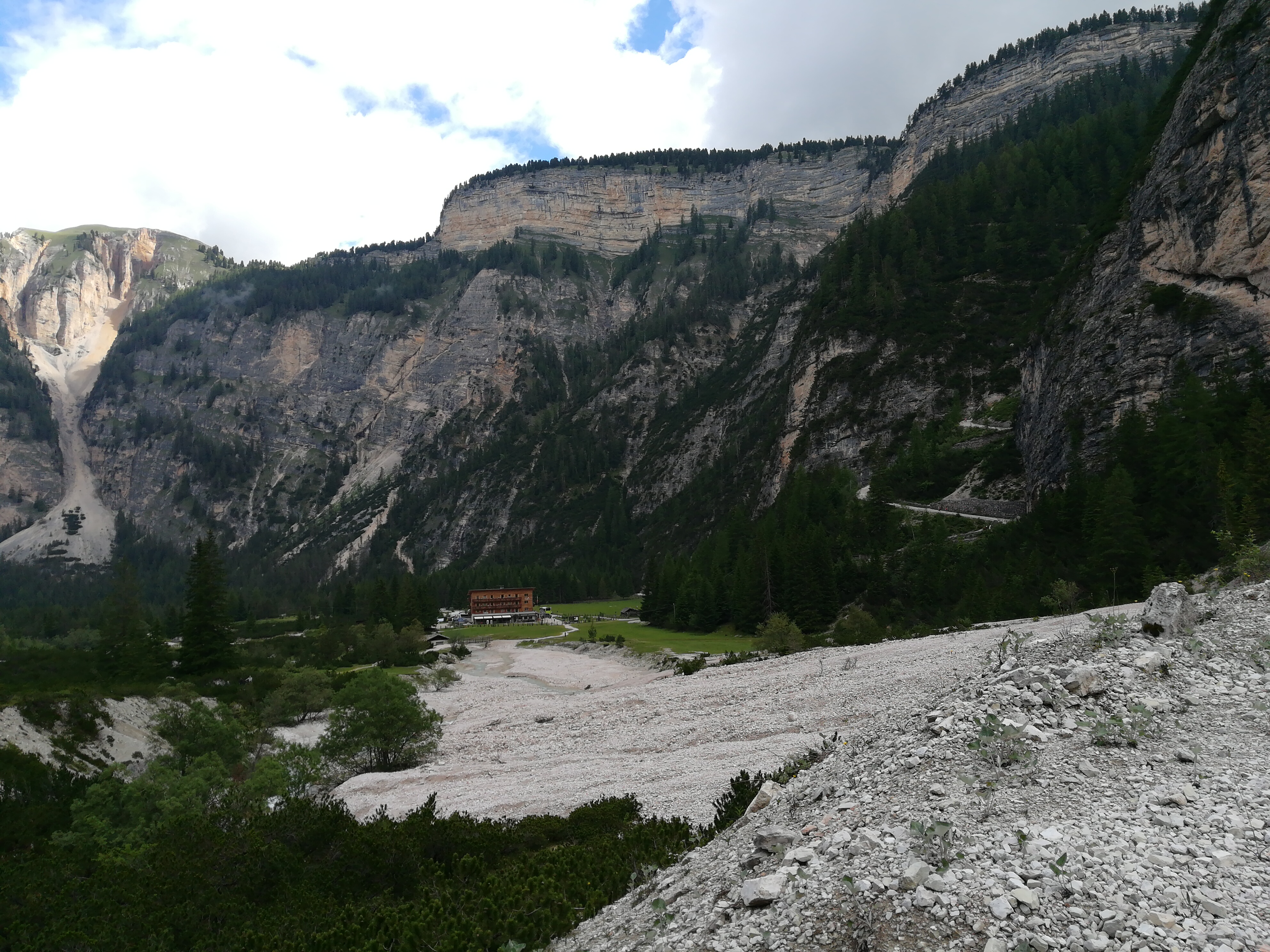 Rifocillati ci gettiamo nel Valon de Lavaredo tutto sassi e giaroni, affrontando alcuni tratti a spinta dove il sentiero scompare a causa delle forti piogge. Finita la discesa inizia la salita della val D’Onge fino alla forcella Maraia e al rifugio Città di Carpi, quasi una corsa ad ostacoli con le tante piante cadute di traverso al sentiero.