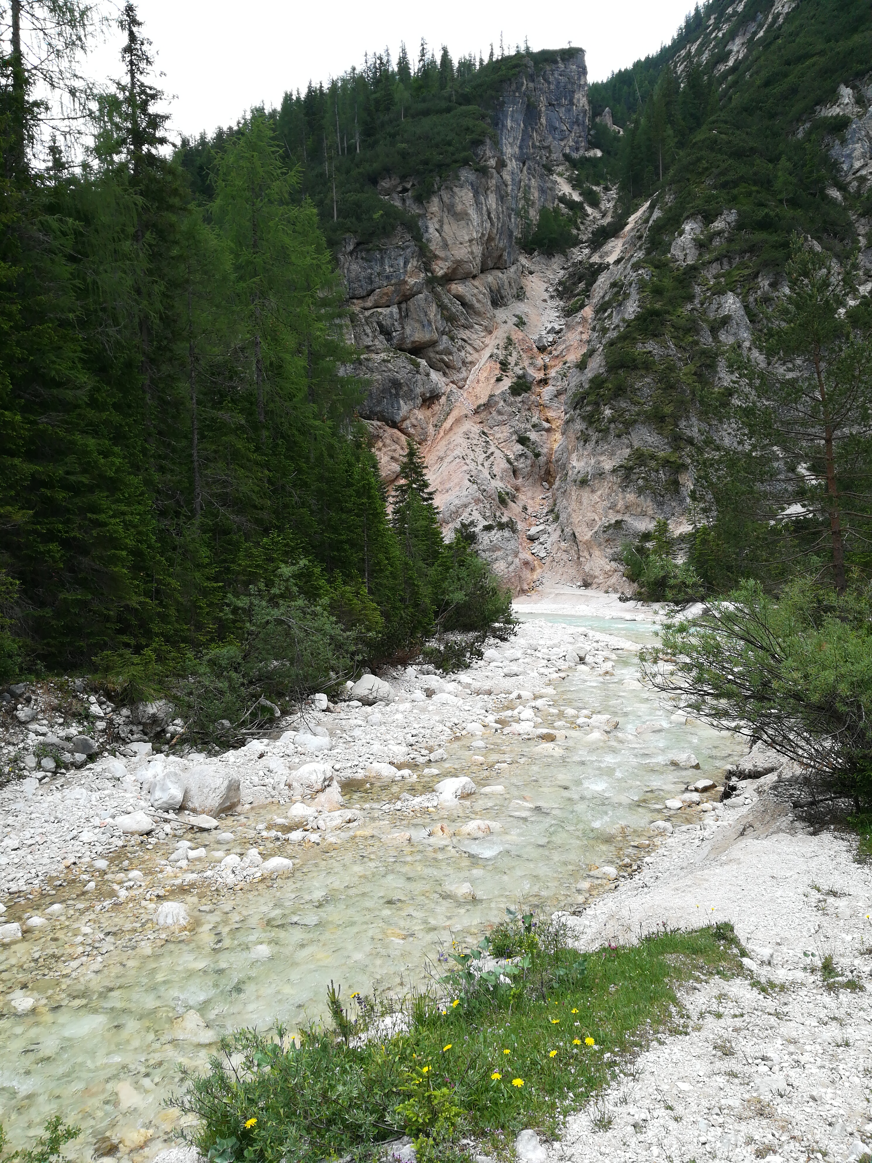 Scendiamo a valle e costeggiamo il torrente Boite lungo un bel sentiero nel bosco che fra saliscendi, radici e prati in fiore ci riporta verso Cortina.